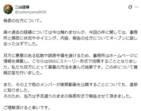 脱退発表翌日に三山さんは自身のXにて